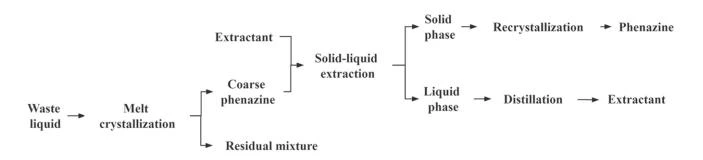 Many researchers have achieved excellent results in the separation and purification of substances using the coupling process of melt crystallization and extraction. Hammon et al. (2006) developed a method for purifying melts in at least one monomer raw material. In this process, a crude melt of one or more monomers is obtained through extraction or other methods, and then melt crystallization is used to separate one or more monomers from the crude melt.Li et al. (2015) worked on the separation and purification of phenazine from waste generated during the production of 4-aminodiphenylamine. The process flow is shown in Figure 2. First, crude phenazine is separated from the waste liquid via melt crystallization. Next, impurities in the crude phenazine are removed using extraction. The resulting phenazine is recrystallized to obtain the final product, which has a phenazine purity of 99.5% and a yield of approximately 85%.Compared with traditional separation methods, the coupling process reduces pollution from the “three wastes” (wastewater, waste gas, and solid waste), lowers production costs, and plays a significant role in enhancing by-product value, achieving cleaner production, and promoting sustainability.