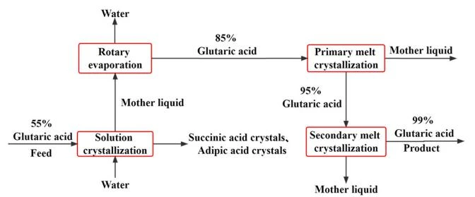 Zhou et al. (2019) used a coupled melt crystallization and solution crystallization method to purify succinic acid from a mixed dicarboxylic acid solution containing succinic acid, glutaric acid, and adipic acid. First, the mixed dicarboxylic acid solution was separated by solution cooling crystallization, and the solvent was removed from the mother liquor using a rotary evaporator. After optimizing the process parameters, the content of glutaric acid was increased from 56% to 85%. After two stages of melt crystallization, glutaric acid with a purity greater than 99% was obtained. The process flow is shown in Figure 3.
